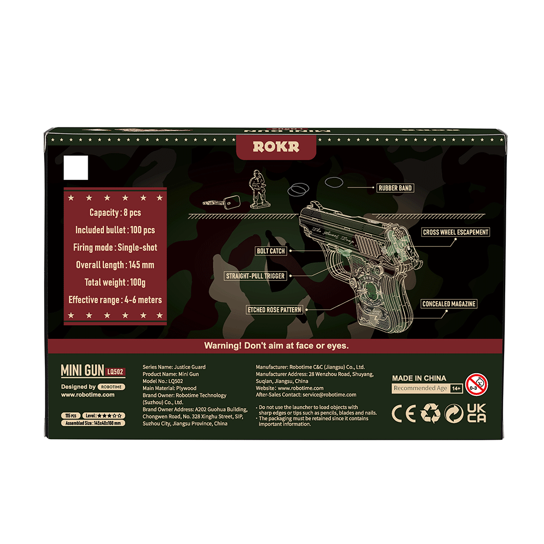 Stilingas ir kompaktiškas modelis, kuris atrodo toks tikroviškas, kad sunku patikėti – tai 3D medinė dėlionė. Šis pusiau automatinis pistoletas turi sklandų veikimo mechanizmą, nuimamą šovinių dėtuvių imitaciją, šaudo gumytėmis bei išsiskiria itin kruopščiai išraižytomis detalėmis. Tobulas pasirinkimas mėgstantiems originalias, rankomis surenkamas pramogas.